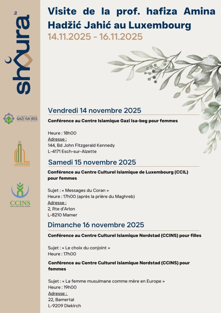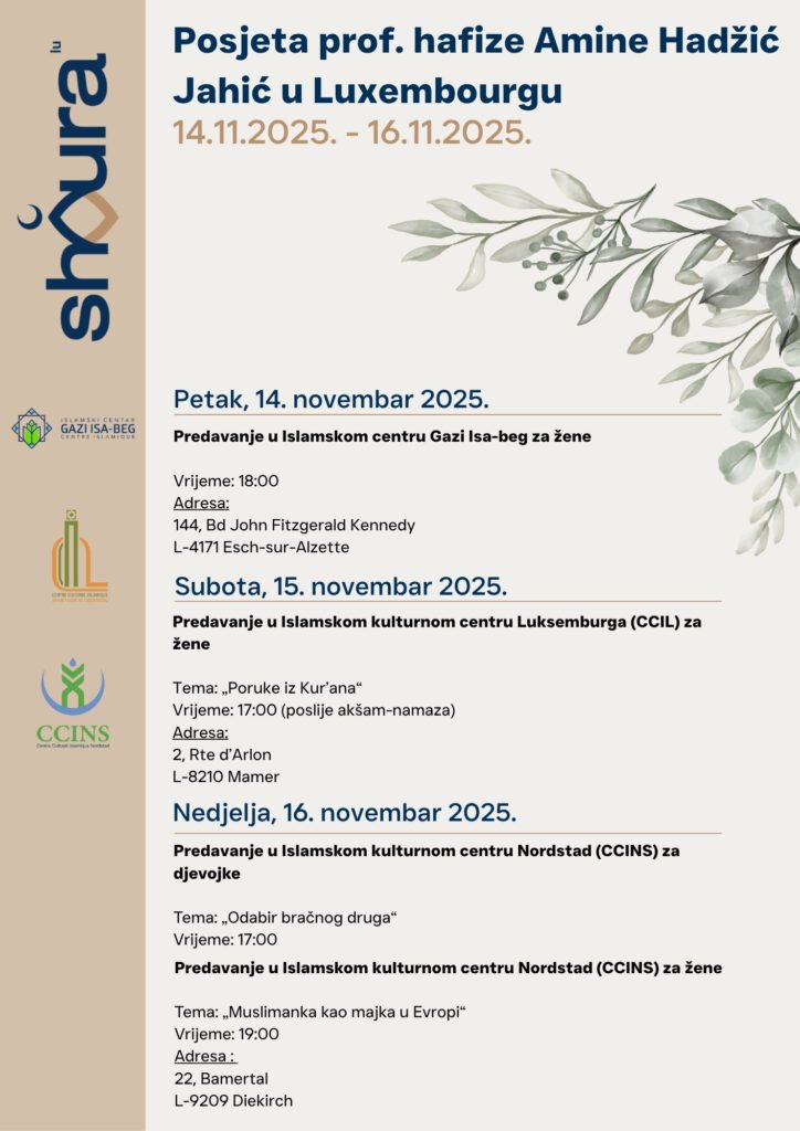 Visit of Prof. Hafiza Amina Hadžić Jahić to Luxembourg 18 18 people viewed this event. Register for event To register for this event please visit the following URL: → Date And Time 14 November 2025 to 16 November 2025 Location -Share With Friends Facebook Twitter Linkedin Xing Pinterest
