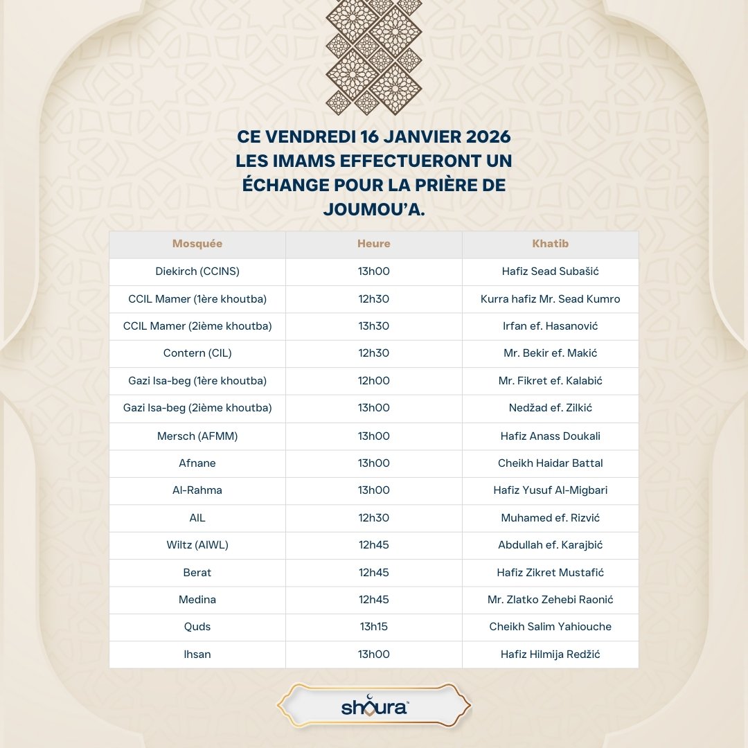 Échange des imams pour la prière du vendredi 54 54 people viewed this event. S’inscrire à l’évènement Pour s’inscrire à cet évènement, Veuillez vous rendre à l’URL suivante : → Date et heure 16 janvier 2026 Lieu -Partager avec des amis Facebook Twitter Linkedin Xing Pinterest