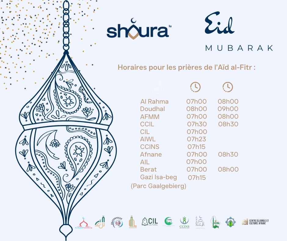 Horaires pour les prières de l’Aïd al-Fitr 23 23 people viewed this event. S’inscrire à l’évènement Date et heure 20 mars 2026 Lieu -Partager avec des amis Facebook Twitter Linkedin Xing Pinterest