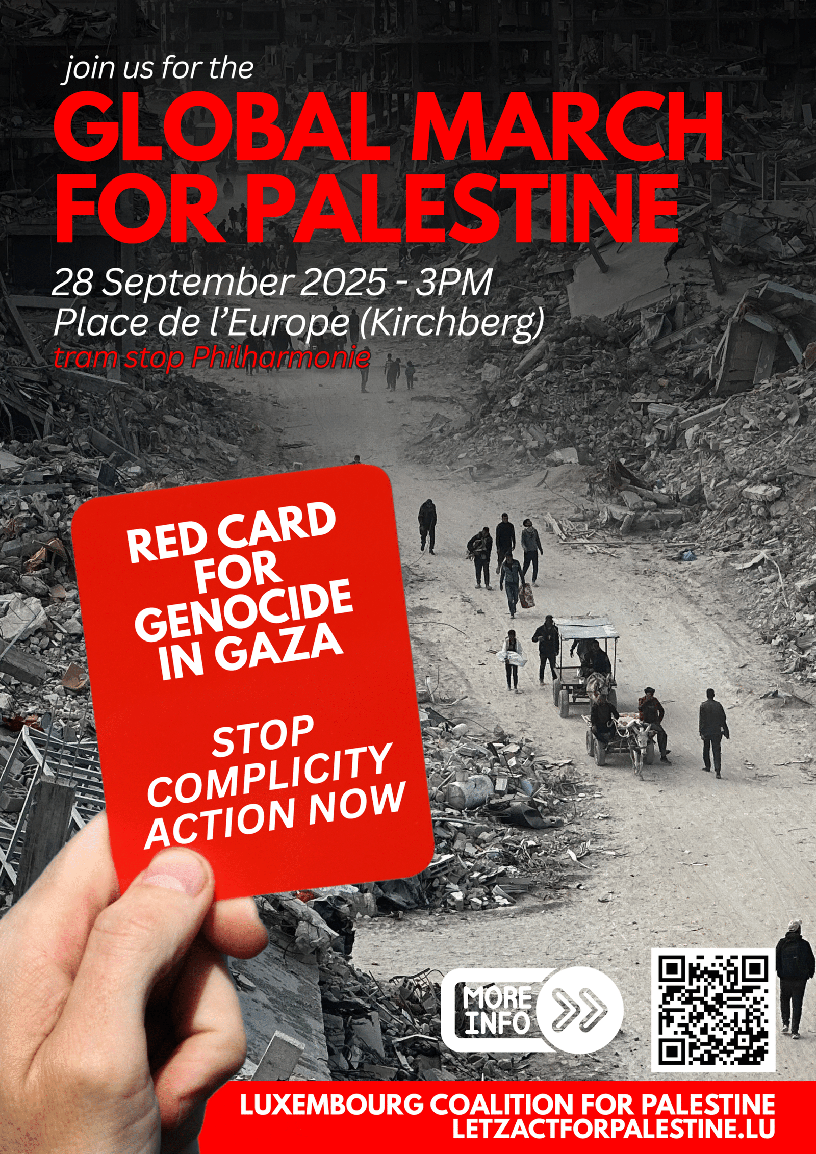 Face à la tragédie humanitaire qui se déroule à Gaza, une Coalition luxembourgeoise pour la Palestine, regroupant diverses ONG, associations et mouvements citoyens, appelle à une manifestation nationale le dimanche 28 septembre 2025 à Luxembourg-ville.