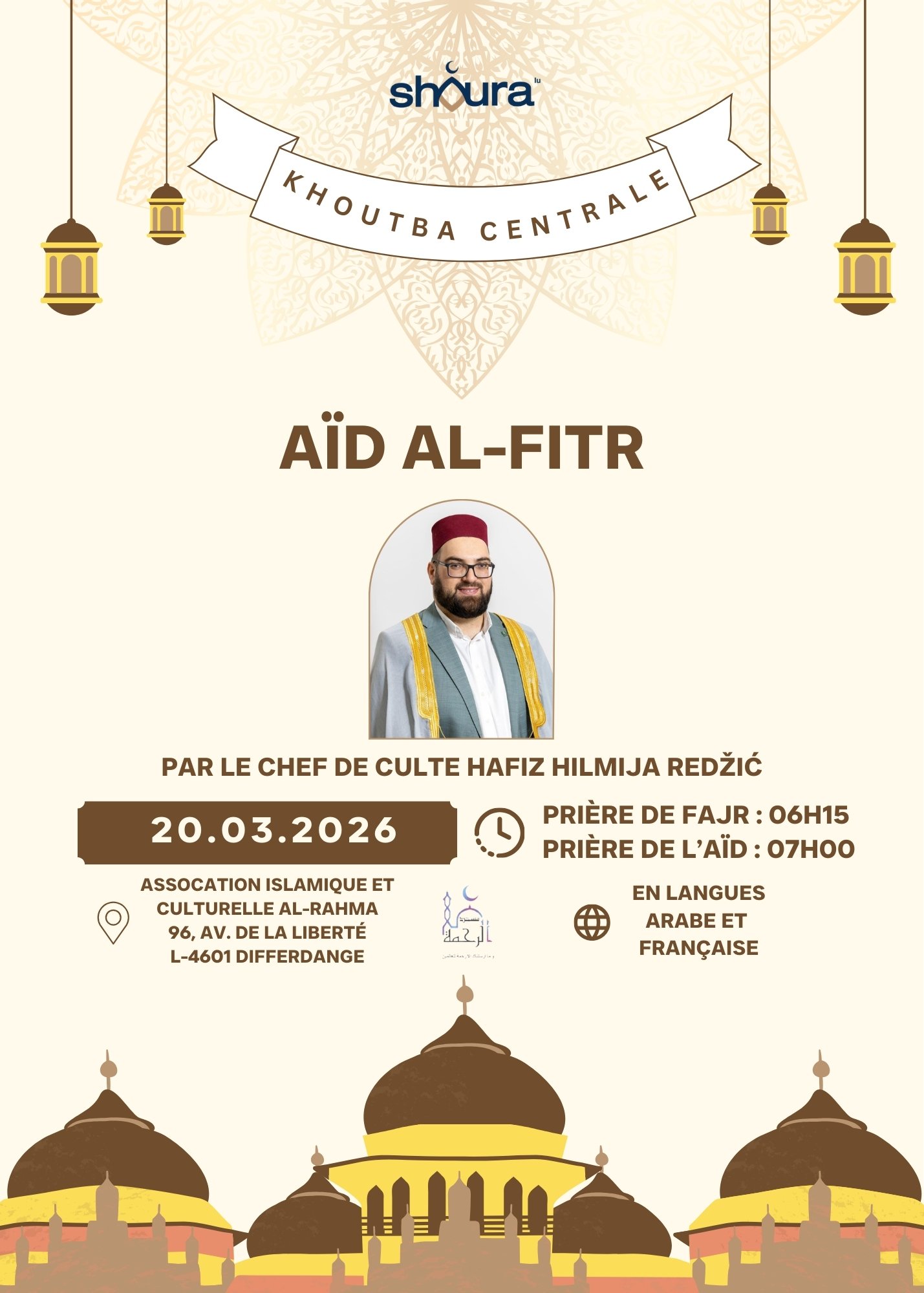 Prêche (khoutba) central de l’Aïd al-Fitr 30 30 people viewed this event. S’inscrire à l’évènement Date et heure 20 mars 2026 @ 07:00 Lieu 96, Avenue de la LibertéPartager avec des amis Facebook Twitter Linkedin Xing Pinterest