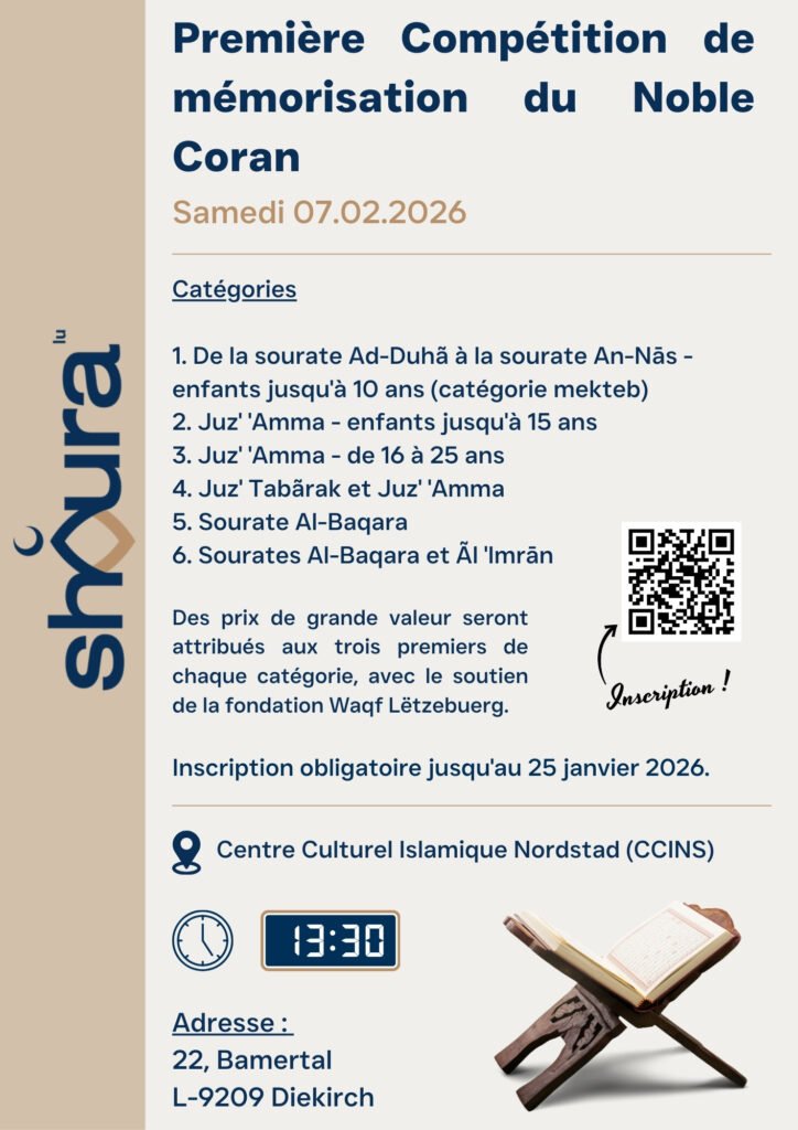 La Shoura – l’Assemblée de la Communauté Musulmane du Grand-Duché de Luxembourg, vous invite à la première Compétition de Hifz du Noble Coran qui se tiendra le samedi 7 février 2026 au Centre Culturel Islamique Nordstad (CCINS) à Diekirch.