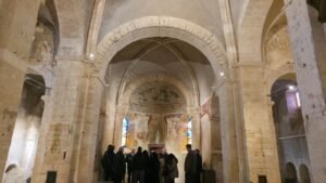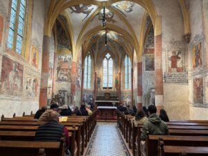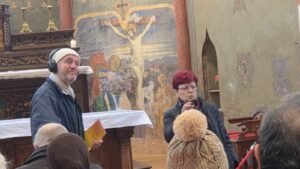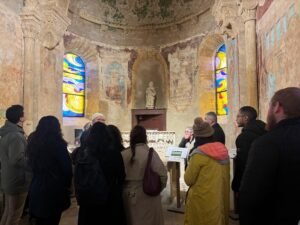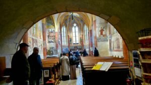 La visite s’est poursuivie au village de Sillegny et à l’église Saint-Martin, souvent surnommée la « Chapelle Sixtine de Seille » en raison de ses fresques murales exceptionnellement bien conservées. L’intérieur de l’église est couvert de scènes tirées du Coran, de récits bibliques, de vies de saints et de représentations du Jugement dernier, datant de la fin du Moyen Âge et de la Renaissance. Pour les participants, cela a été l’occasion de voir de près comment les gens de l’époque imaginaient le monde spirituel, le paradis, la punition et l’espérance dans la miséricorde divine, et de réfléchir à la manière dont l’art servait de « école de la foi » pour les fidèles illettrés.